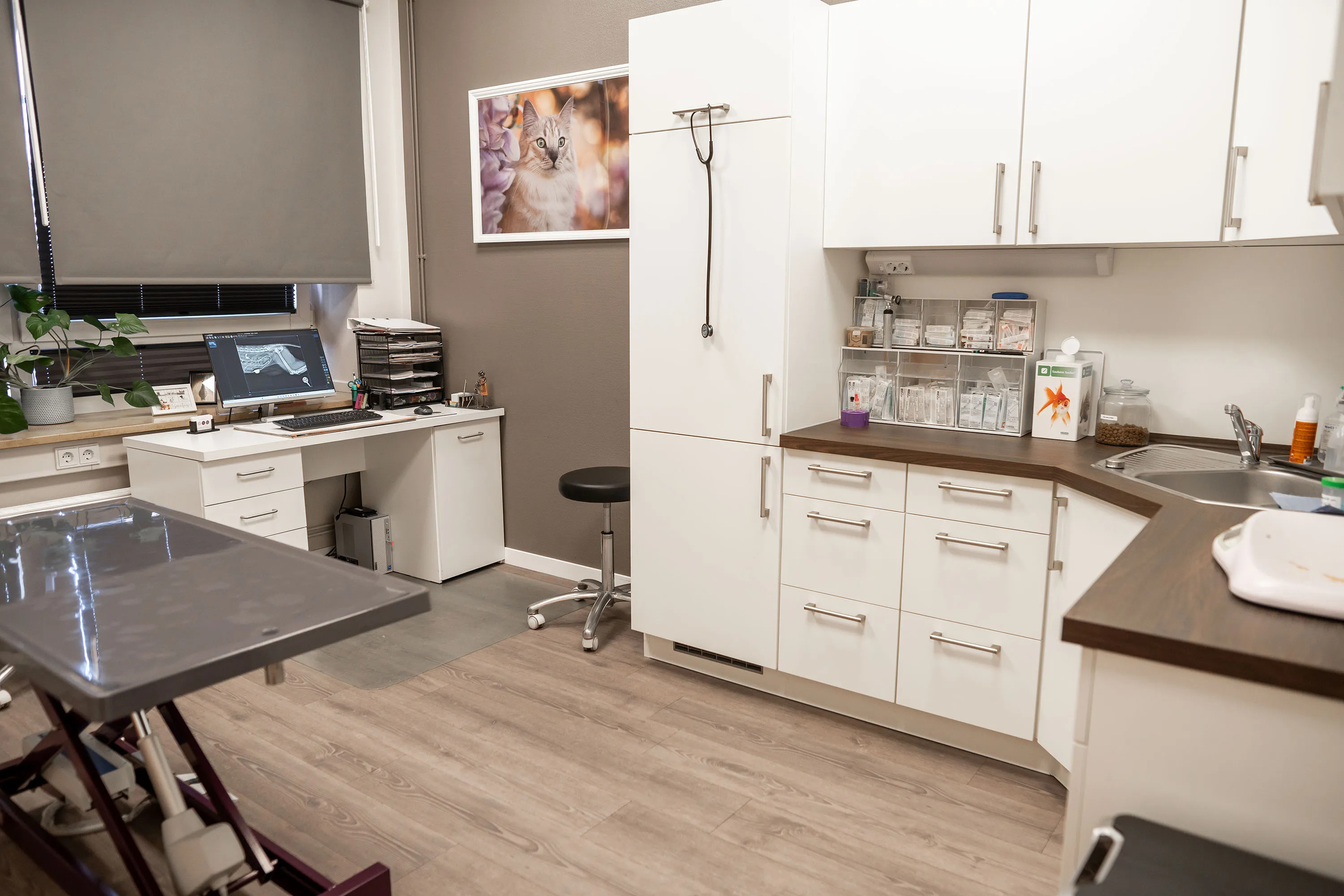 Der Schwerpunkt unserer Kleintierpraxis liegt in der sonografischen Diagnostik. Wir haben zwei hochwertige Ultraschallgeräte für Abdomen, Herz, Knie, Schilddrüse usw. Des Weiteren haben wir ein komplettes Labor inklusive ionisiertem Calcium, Gerinnung, Färbebank, Procyte, Catalyst und Sedivue. Außerdem haben wir eine Zahnstation, flexible und starre Endoskope sowie einen OP-Raum mit Inhalationsnarkose für Weichteilchirurgie inklusive Elektrochirurgie. Für unsere Teammitglieder haben wir einen gemütlichen Aufenthaltsraum mit kleiner Küche und Geschirrspülmaschine. Die Praxiswäsche wird in der Praxis gewaschen. Fußläufig gibt es einen kleinen See, an dem man in der Mittagspause die Natur genießen kann.